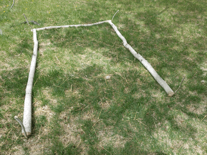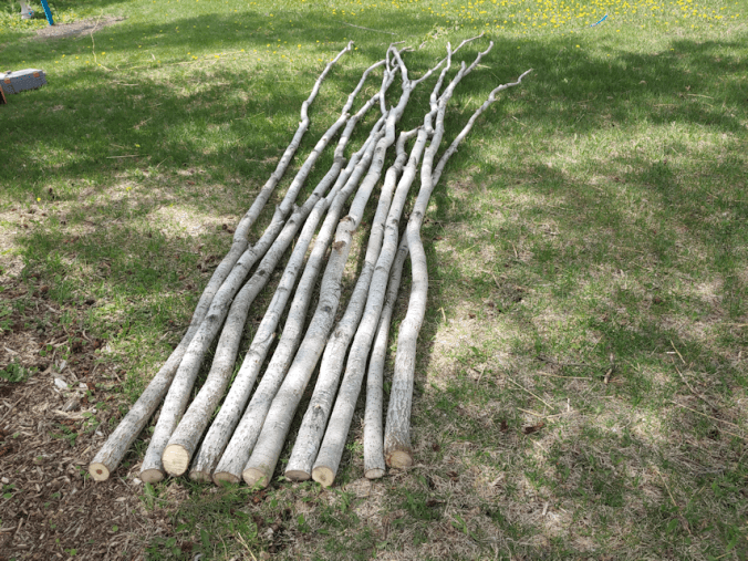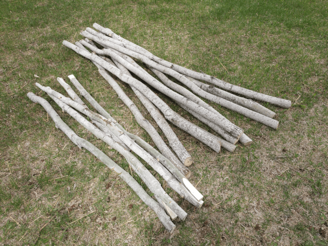 The first thing to do was go through our pile of poplar we’ve cleared out of the spruce grove, and pick the strongest, straightest ones. Straight for the first 7 feet, at least!