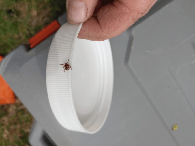 While preparing to screw the pieces together, I found our first wood tick of the season! We ended up finding a couple more, later on.