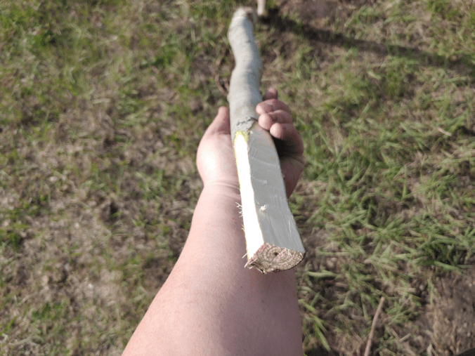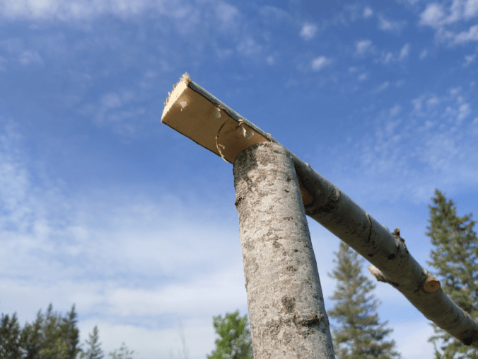 The upright supports were cut to 7 feet, but there was still enough from each of them to cut cross pieces at 5 1/2 feet. Of those, the strongest ones were selected, and at least 3 inches was trimmed from each end to have a narrower, flattish part to attach to the uprights.