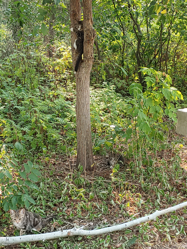 Later I found Bradicus just going nuts in this tree! :-D Chadicus is at the bottom of the tree, and Caramel is in the foreground.