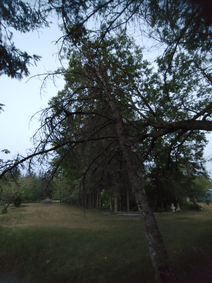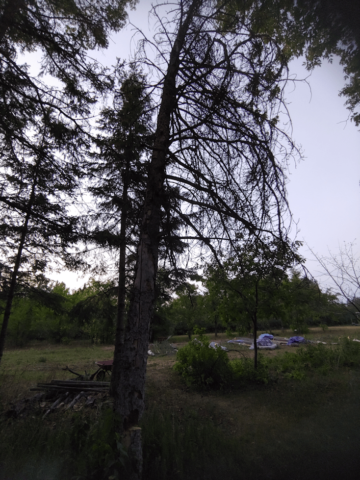 So tonight, when it was a bit cooler and there was still some light out, I decided it was time to take down one of the dead spruce trees.
