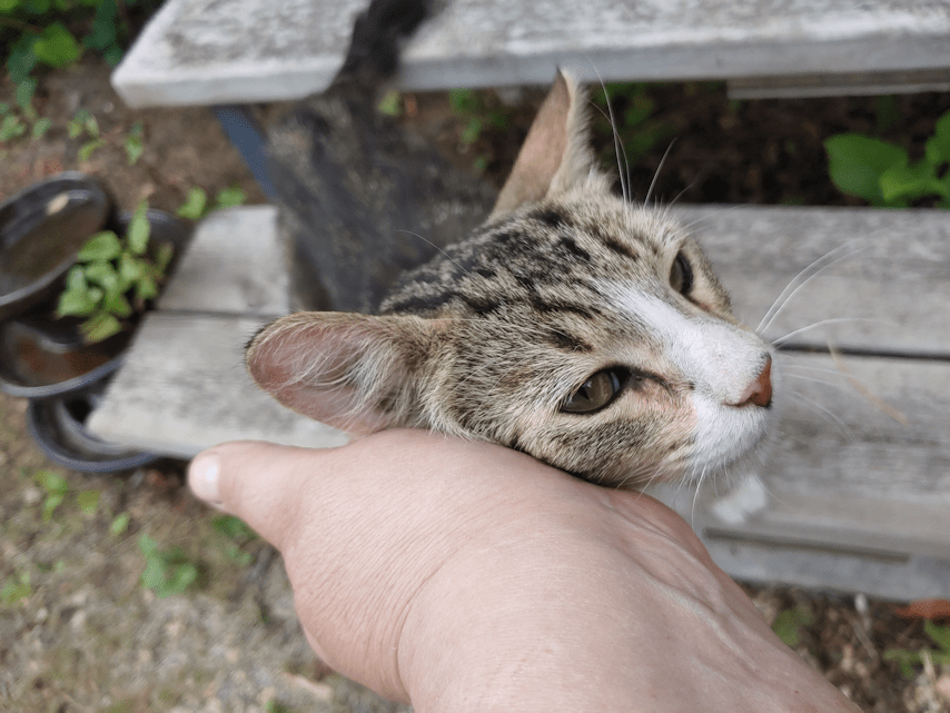The cat started to run off but quickly stopped and meowed at me. When I called to him, he came right over and before I knew it, I was being happily snuggled by a Potato Beetle. I didn’t have my phone with me, so it wasn’t until he went to get a drink of water that I was able to dash in to get it and get photos.