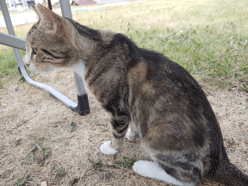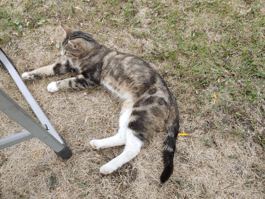 I haven’t seen Potato Beetle in months! I even checked my photos, and the last ones I have of him were taken in February. That’s when we found him with a big bite in his hip. We got him to the vet, then had him isolated in the sun room for a few days. Shortly after he had access to the outdoors again, he disappeared. The next month, Nostrildamus disappeared, then Creamsicle, and then Ginger showed up with his leg dangling and had his amputation.