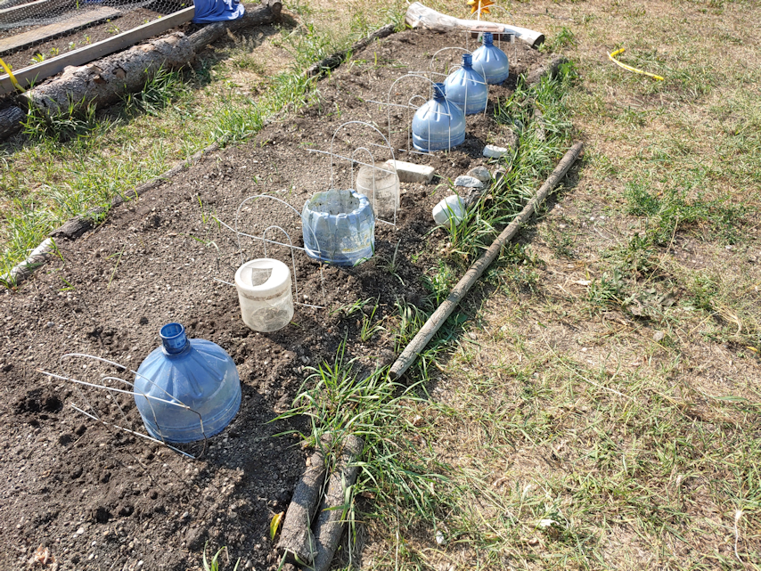 We rigged what we could to protect the last bed, but the grasshoppers really did a number on the seedlings. I ended up using old water bottles with their bottoms cut off to protect the remaining bits of seedlings, hoping they would recover. As you can see by the green in some of the bottles, there has been growth!