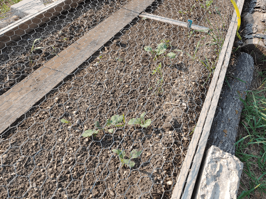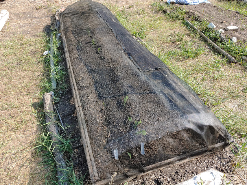 The surviving seedlings in the now-uncovered bed to things much bigger than little water bottles to protect them. The grasshoppers can still get in, but it’s still better than nothing.