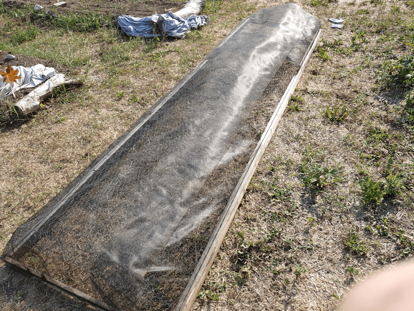 Whatever we end up with, having window screen mesh on a frame to keep the insects out seems to be more practical than the mosquito netting we’re using as floating row covers.