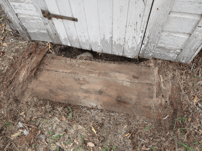 The outhouse is sitting on top of two large beams, which extend in front. The piece I’d removed was nailed to those beams, but everything was so rotted, there was nothing holding anything anymore.