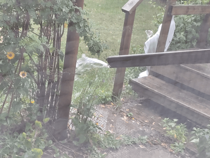 I’d been moving the kibble container for Butterscotch and her babies around, to encourage them to come closer to the house. Having it on the concrete steps has been a bit of an issue, as I kept finding the container elsewhere. Likely dragged around by skunks. So yesterday, I put it in the slightly raised bed near the steps, where the cats like to hang out.