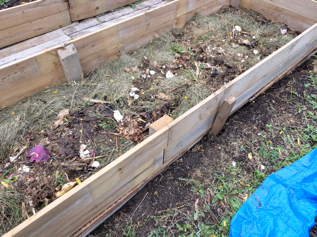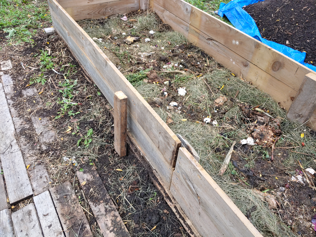 As you could see from the previous photo, the box is not full to the top. It is, however, at a stage that it could be left as is, and be ready for planting in the spring. I might have a lead on getting a truck load of manure. If that pans out, and we can get some this fall, I would use some and, together with the garden soil and probably other organic material, top up the boxes. We shall see. Either way, this should all settle further over the winter, so I expect to need to add more material in the spring, before planting.