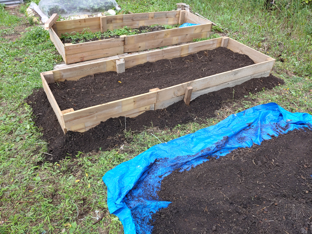 Next, I shoveled about half of the soil into the box, raking it out against the sides a bit, then added soil all around the box to bury the wood foundation. In total, that took up about 2/3 of the soil on the tarp. The wood foundation will break down over time, and I expect the whole box will slowly sink with it, but I don’t expect this to last more than a few years. Hopefully, by the time these need to be replaced, we’ll have access to more permanent materials and can replace them with high raised beds.