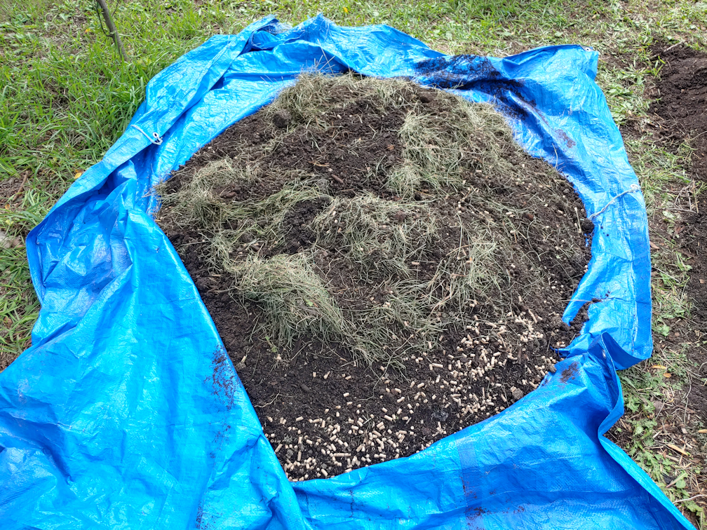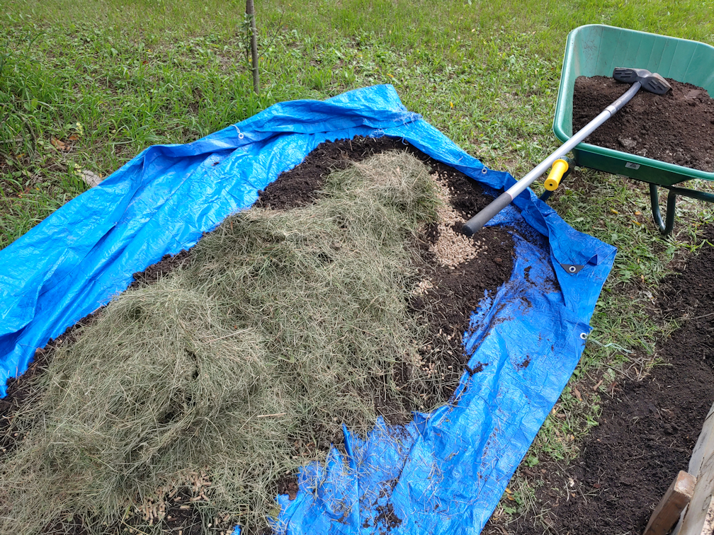 The whole thing was mixed together using a garden fork and the tarp itself. After a while, I shoveled about a third of it into the box, then used the tarp to mix it some more, shoveled more into the box, mixed the remains with the tarp again, and by then I was able to use the tarp to heave the whole thing into the box and dump the mixture out.
