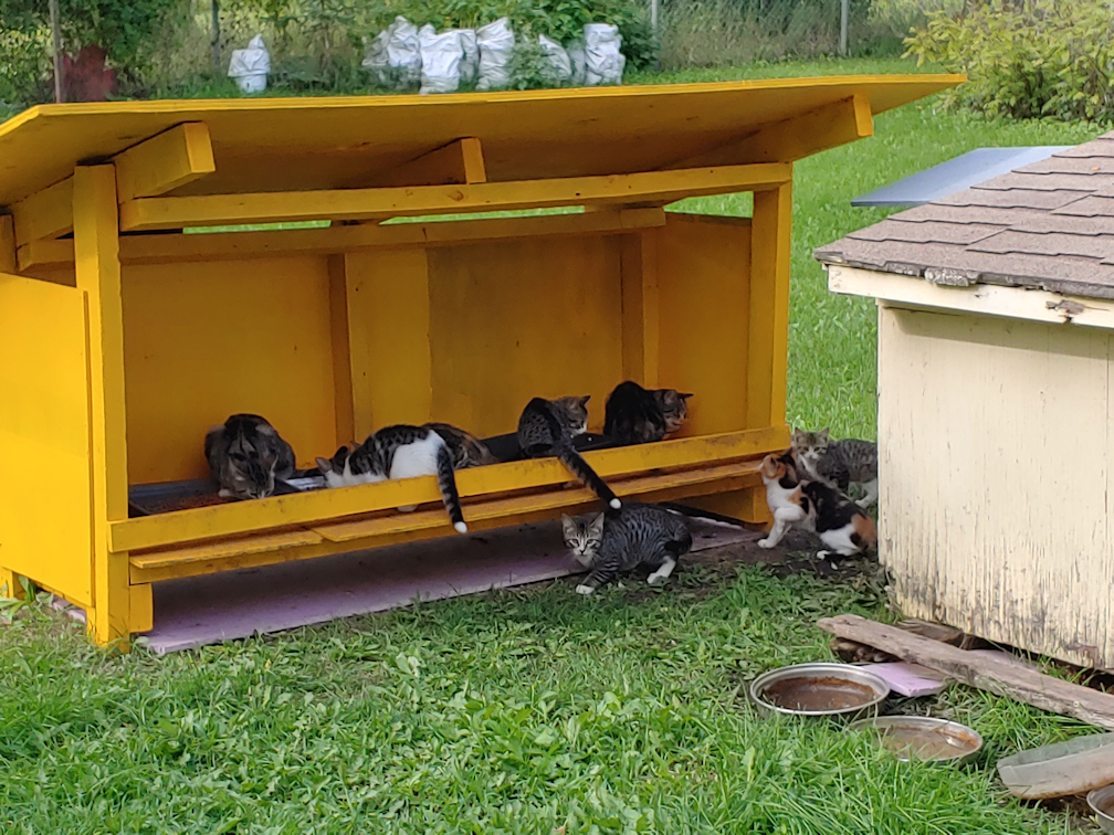 I was a bit late heading outside to start my morning rounds. As I went into the sun room, there was a sudden chorus of meowing outside the door. There was at least half a dozen cats and kittens, crying for kibble! :-D