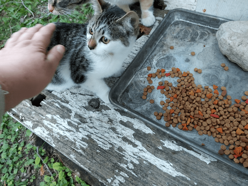 While topping up the yard cat’s kibble trays last night, I actually got to pet a kittie!