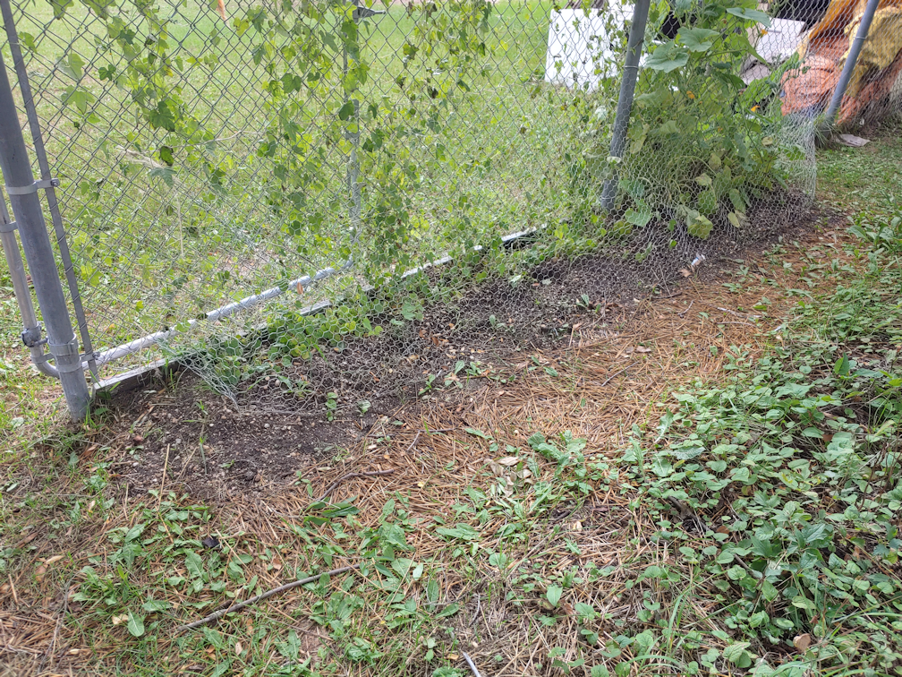 This is where they are going to go, when it’s time to clean up the cucamelons and gourds. We were intending to have them here for this year’s garden, but were not able to get them out of the basement in time, so I want to get that done little by little until they are needed. In this spot, the ground slopes just enough that there is a larger gap under the chain link fence. The cardboard flaps we pushed up against the fence before adding the soil ended up falling under, and the soil started washing away when we watered, so I had to use boards I found in the barn to short it up. The blocks will eliminate that problem, and will make good “containers” to plant into next year.