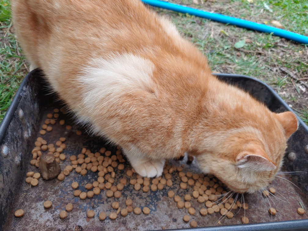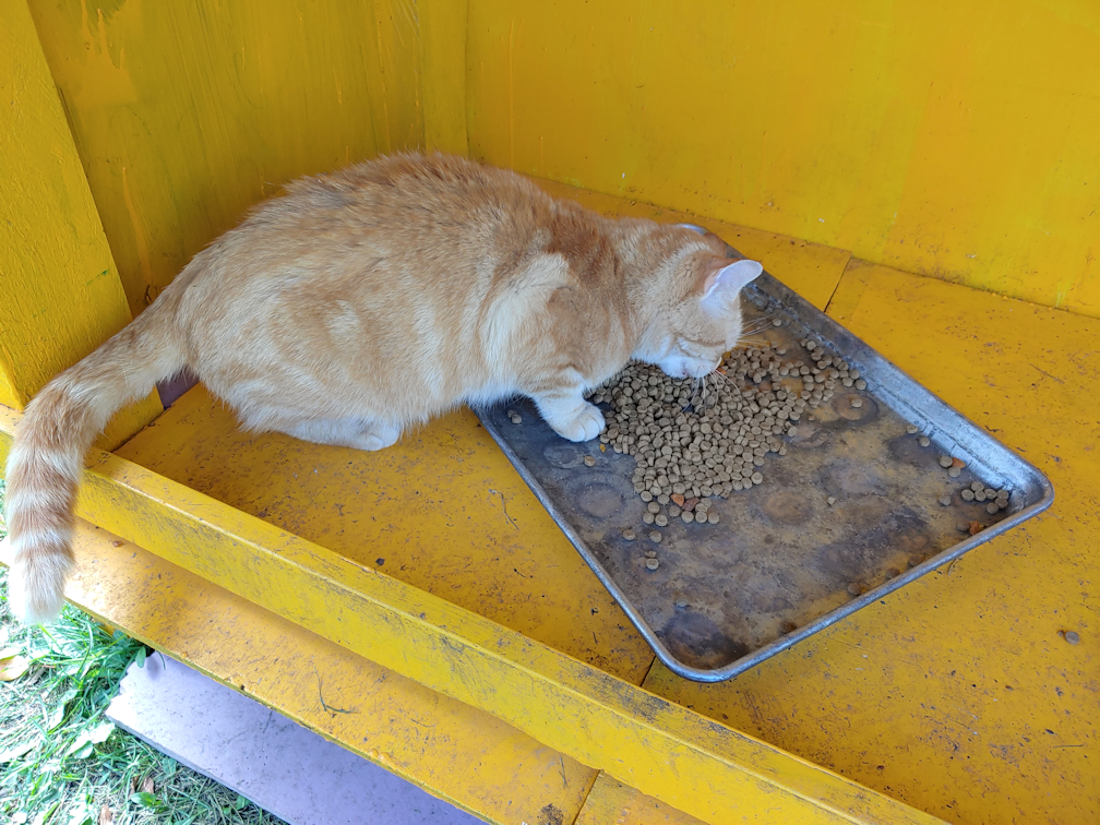 By the time we got to the kibble house, all the other cats were done eating and were gone, so she had a chance to have breakfast in peace.