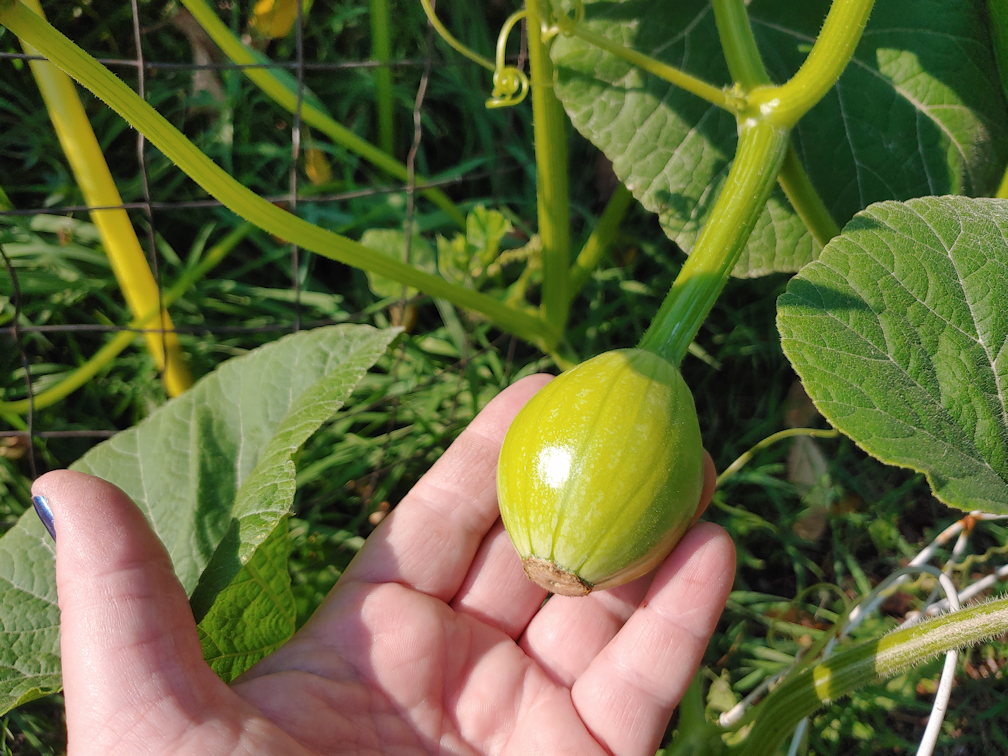The very first squash that we found, way in the middle of the two plants, did end up withering away and dropping off, but these two that developed next are getting bigger and look like they are going to make it.