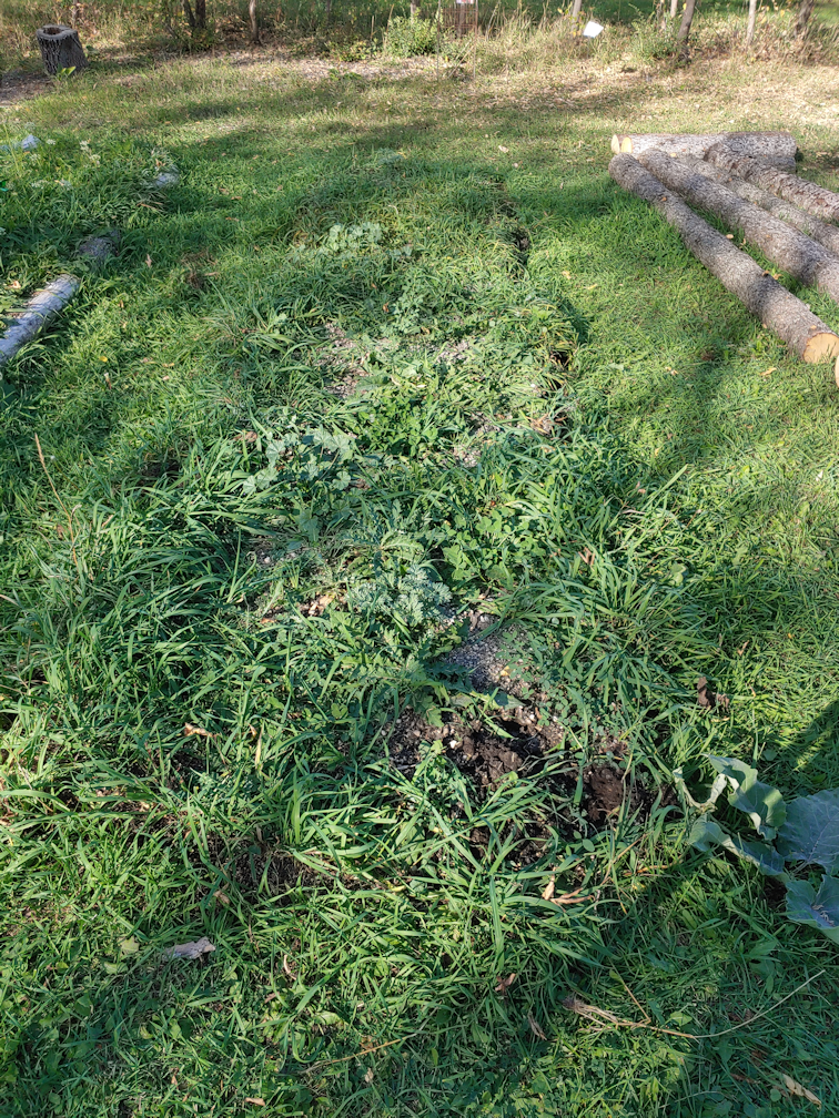 The next step will be to level this off and straighten the edges for the logs. I cut the logs a bit longer than 9′ and 4′, to give room to trim the ends straight, but I may not even bother with that. As long as the beds themselves measure no more than 4′ wide on the outside, we’re good. I don’t care if there are bits that stick out a bit further at the corners.