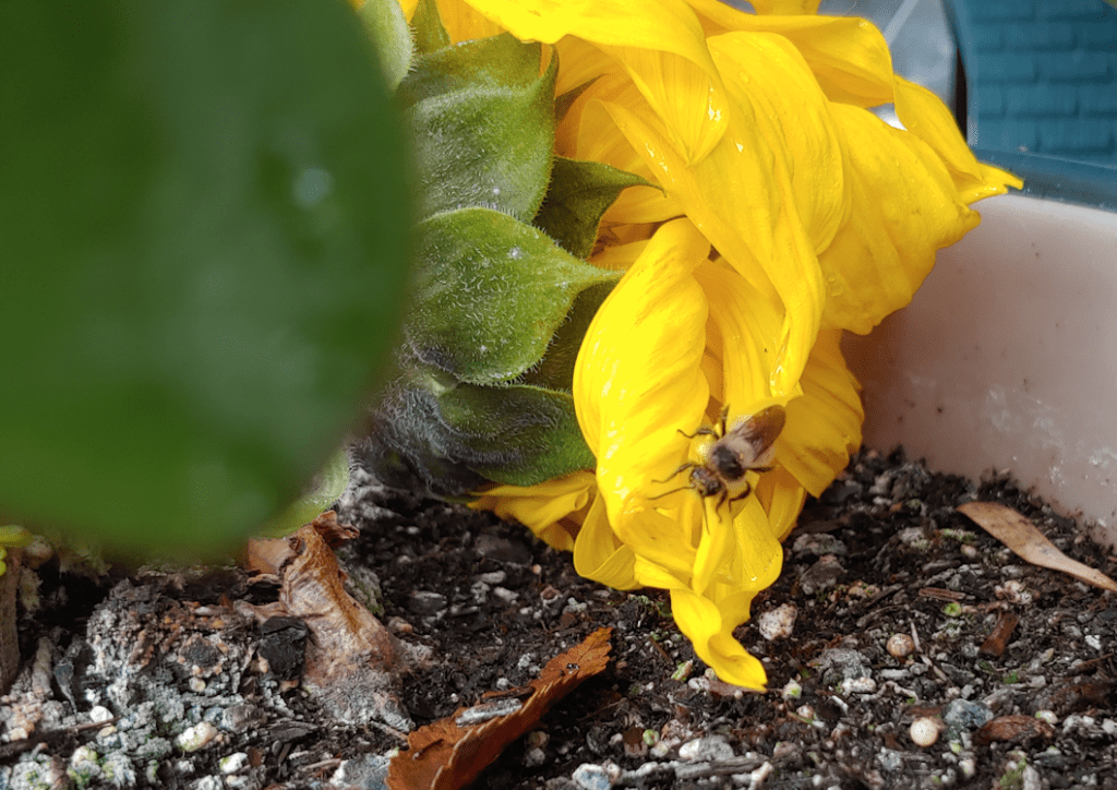 We tucked the entire sunflower into a plant pot (our houseplants are still outside), where it would be more protected, both from the weather and from curious kitties. Happily, it immediately began crawling around even more. Hopefully, it will be able to make its way back to its hive, wherever that may be. Most local bees are more solitary, and have hives underground, so there is no way to know where it came from. At least now it has a chance, and we need all the pollinators we can get!