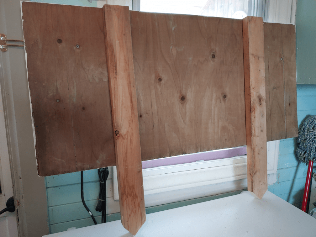 Before adding the second coat of paint, I cut a scrap piece of 2×4 from the wood we found in one of the sheds and brought to the basement a while back, and made “legs”. They are short, but they are something I can work with when we are finally able to put the sign up. Mostly, I wanted them screwed in place before the second coat of white paint was added. That way, I could brush over the screws to make them less visible, while making sure not to fill in the holes for the screwdriver, so they can be taken out easily, if necessary.