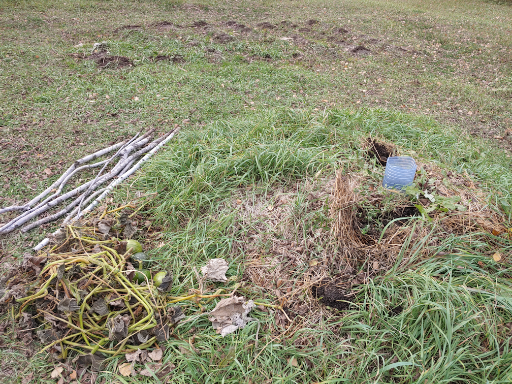 She pulled the Dorinny corn stalks that were next to the squash tunnel, then pulled all the squash, gourds and melon. Aside from the sunflowers, which we will be leaving for the deer to nibble on in the winter, we just need to weed and prep the beds that will be used next year, and put away things like the bin we keep tools and supplies in, empty the rain barrel and put it away for the winter, and take down the last of the critter barriers.