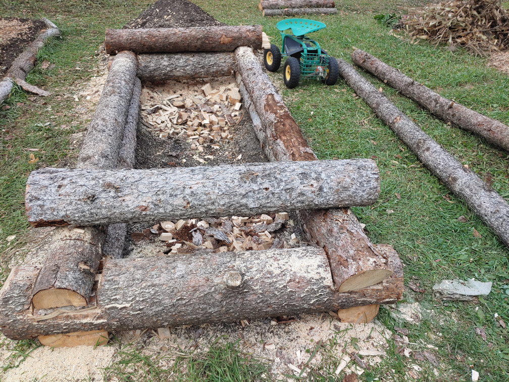 My daughter was able to help with the high raised bed this time. She finished making the notches on the next end piece, in the background, while I cut another 9′ side piece from the last tree we cut down. She does not like using the baby chainsaw, and much prefers a hammer and chisel, so I started on the notches on the end piece in the foreground, until the second battery on the baby chainsaw ran out. By then, it was starting to get dark, so my daughter finished up the end piece she was working on and we called it a day. You can’t see the cuts I made on the end piece in the foreground, as I rolled the log onto them. They make it less likely to roll around, should the cats decide to climb all over it again.