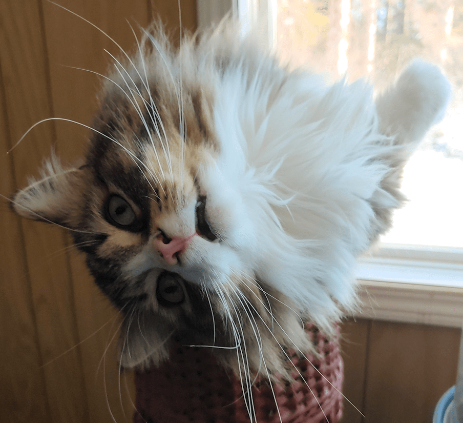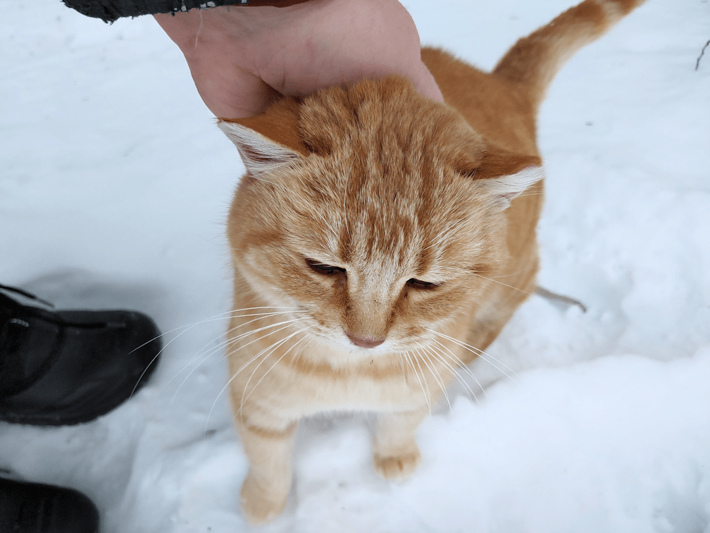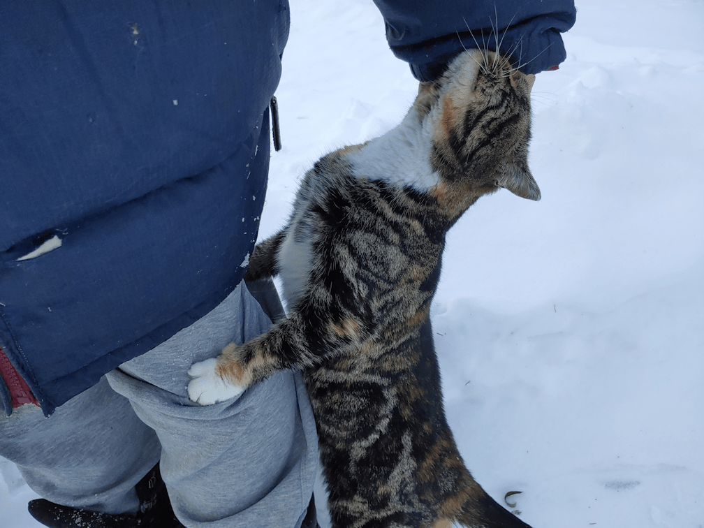 While going back and forth, I usually have several of the adult cats following me around. Among the kittens, it’s been Nosencrantz and Agnoos – until now! This handsome boy has joined the party of cats determined to get stepped on and tripped over! :-D