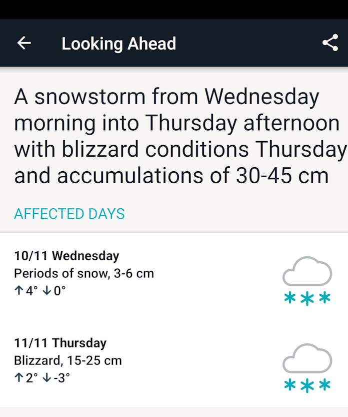 Granted, only the app on my phone says we’re going to have an actual blizzard, whereas my desktop weather app says we’re only supposed to get less than half a centimeter on Wednesday, then possibly 5-10cm of snow on Thursday, but sheesh.