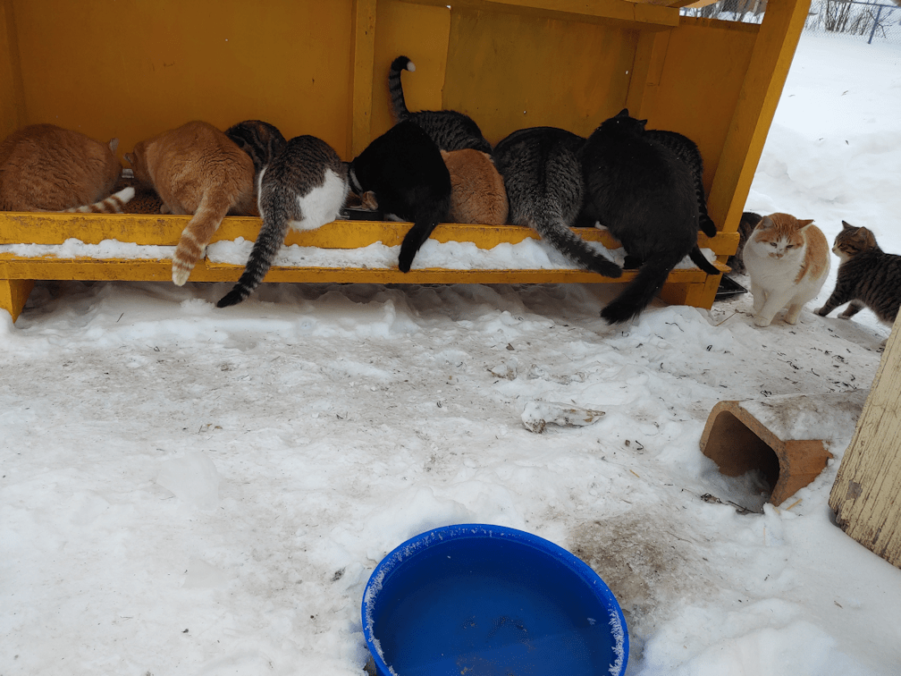 I’m so thankful to my brother for giving us their old dog house. He really went all out, with all the windows, as “porch”, the power outlets inside, the light fixture, and so on. The cats just love it, and it may well have saved a few lives. Farm cats tend to have short life spans, but at least we can keep the cold from getting them!