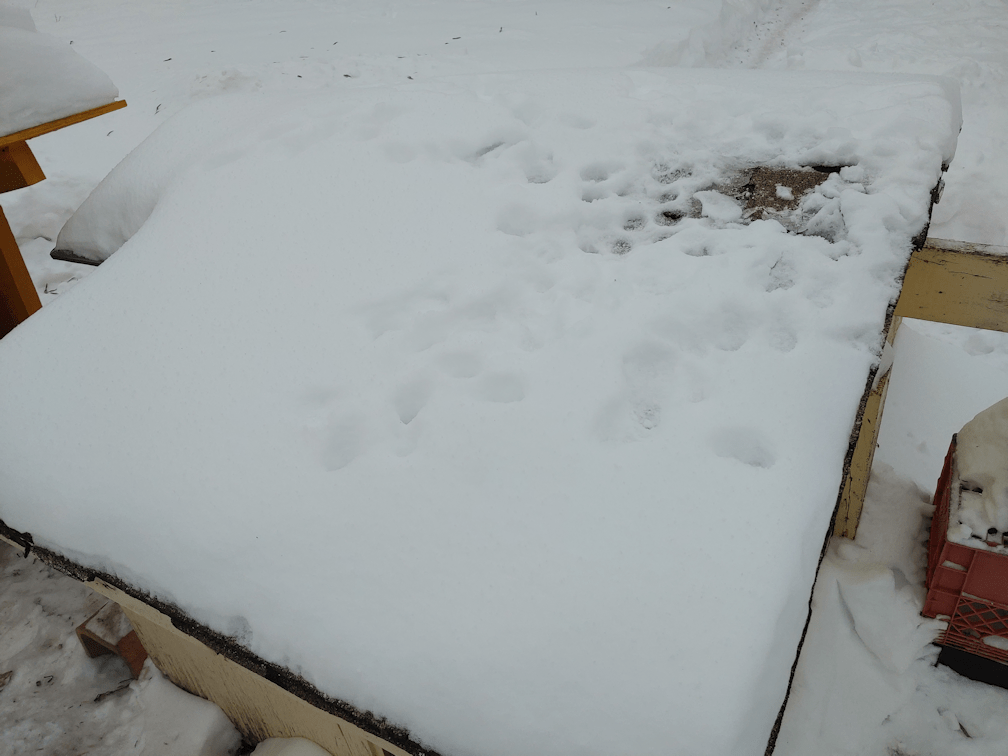 I am not too concerned about the shield being down; it was more an extra layer of protection, and to reflect heat back downwards to the cats. Like the smoke detector we also installed in there, it’s more just that one extra “just in case” bit. The bulb itself has a limited heat range, and the fixture has a steel “cage” to protect the bulb itself. The girls and I will still go out and fix it. In the summer, I could do it myself, thanks to the counterweight making it easier to lift the roof, and keeping it from dropping down again. This time of year, it’s a 3 person job; two to carefully lift the roof and hold it open, since the snow prevents it from being opened completely, and one to climb in and put the shield back.