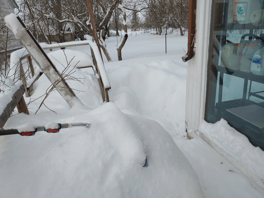 This is why we need the wheelbarrow. We need to remove the snow from around the old basement window – which can’t be seen in the photo. It does have a cover over it, plus a drift in front of it. The shallow storage container visible in the photo was in front of where the sump pump hose comes out of the wall, and is now sitting on the drift, right in front of the basement window.