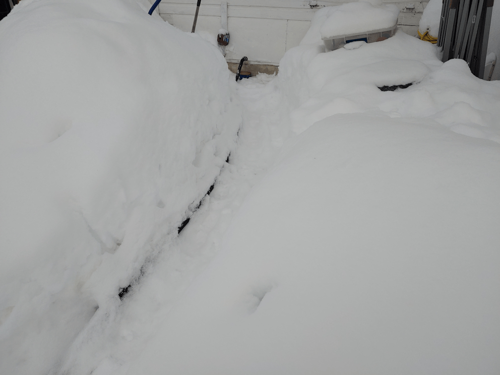 In the process, I want to dig that path down more to the ground, so that the hose from the sump pump has a downward grade again. Right now, there is a bit of a “hill” of snow it’s running across.