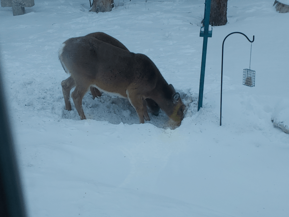 I got some photos yesterday, of the piebald deer visiting again. Her face was packed with snow, from digging under to find the seeds that had been blown over.