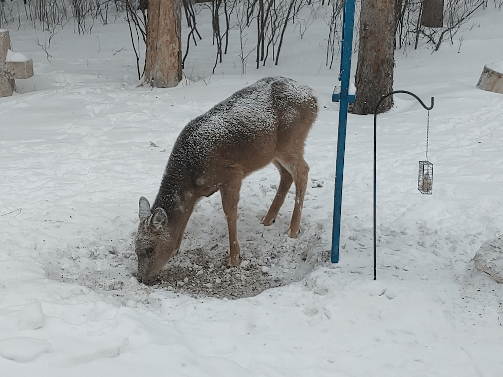 While I was working on the path to the compost pile, the two deer that regularly visit came by! One came all the way to the feeding station, but my being in the path and shoveling ended up being too much for them, and they both ran off. I’m just tickled that they were willing to come as close to me as they did!