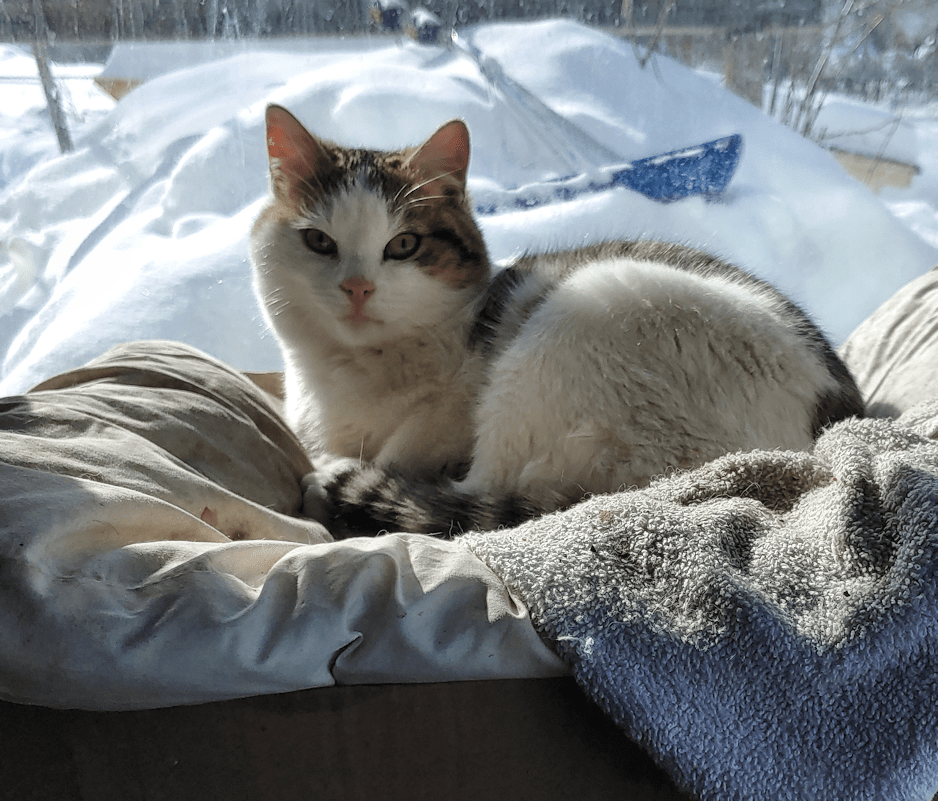 Before going back inside, I found Agnoos had claimed prime real estate in the sun room. :-) One of my daughters headed out later, to continue working on the snow pile, and Agnoos was still there!