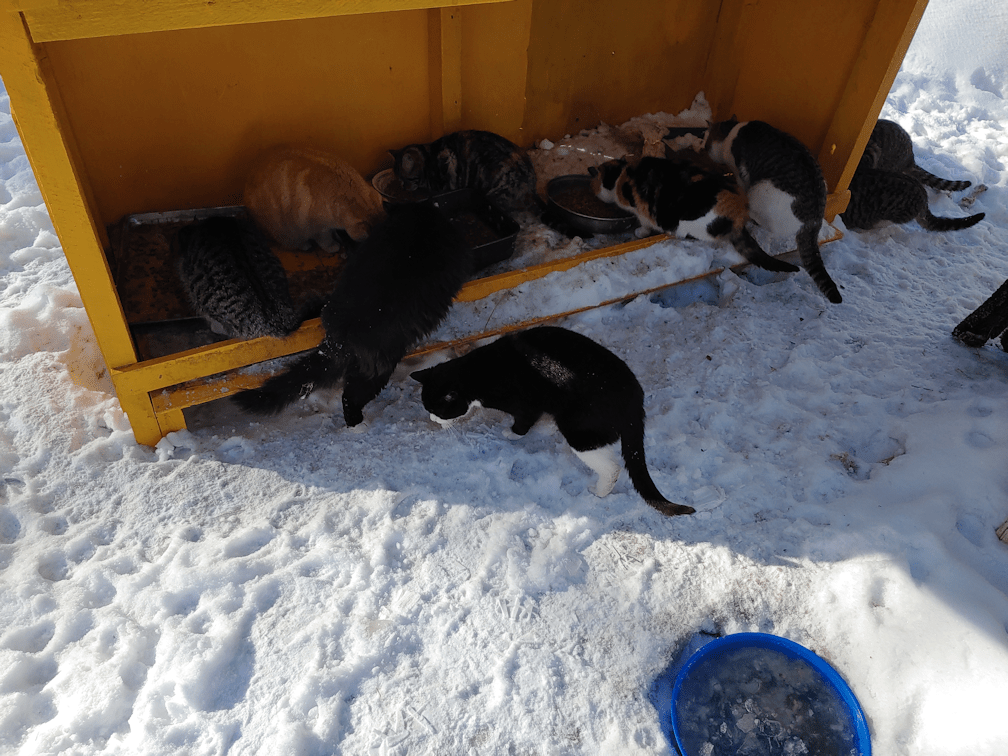 I counted a total of 14 outside cats this morning. They were very happy to see me. The water bowl in the sun room was completely dry, and all the kibble was gone. From the state of things, it looks like something other than cats has been into it. We’d given them a big, meaty turkey carcass to pick at, but something made off with most of the bones last night.