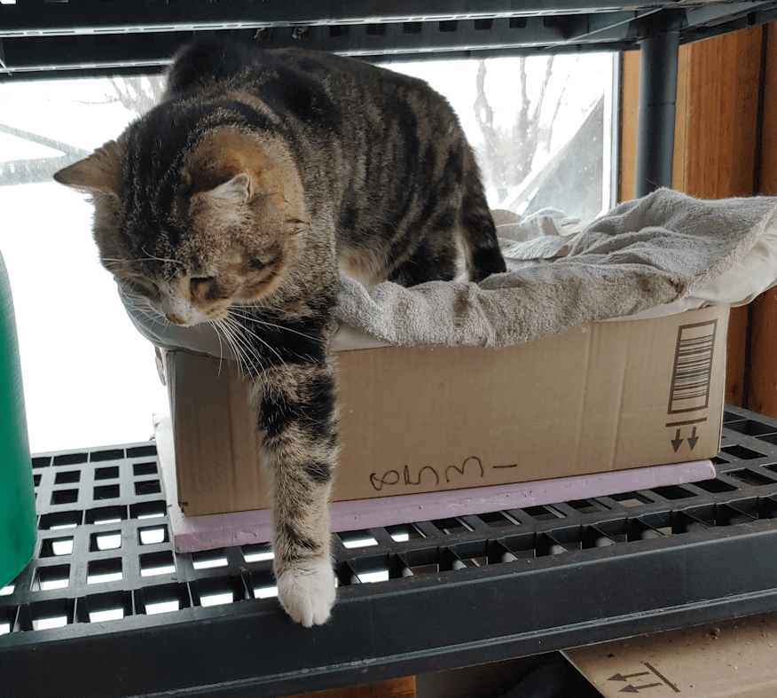Since we’ve been keeping the sun room doors propped slightly open to allow access to the working heated water bowl, he seems to be spending most of his time in there – if he can claim their favourite bed before one of the other cats gets into it!