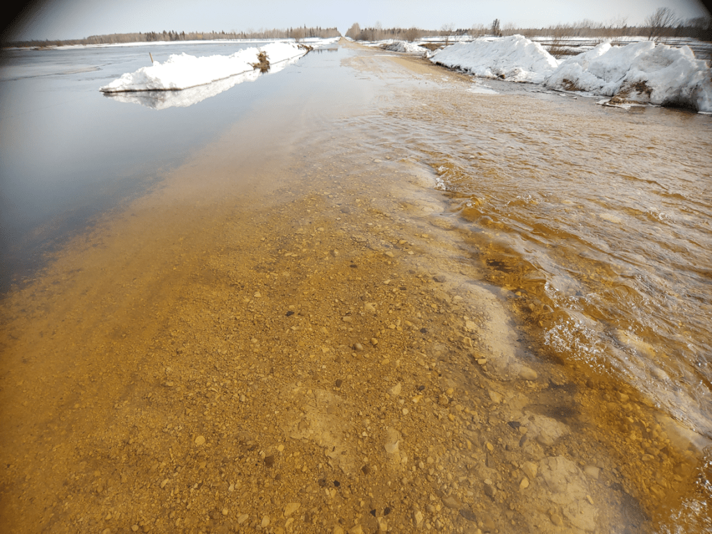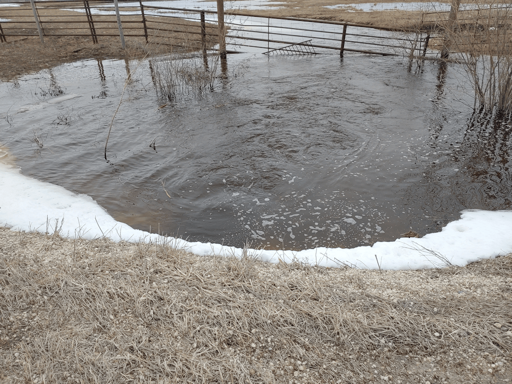You can tell where it is by the whirlpool. It was barely keeping the water flowing at an adequate rate. The field behind is completely underwater. That line of snow you see? That’s the drainage ditch.