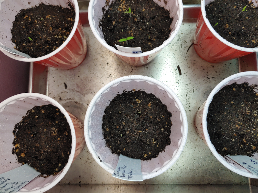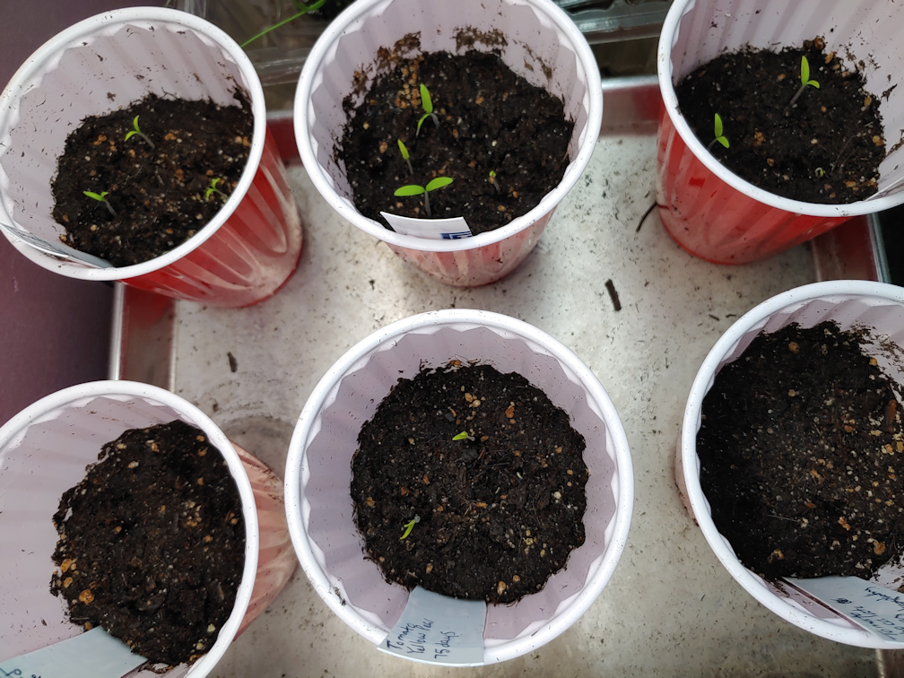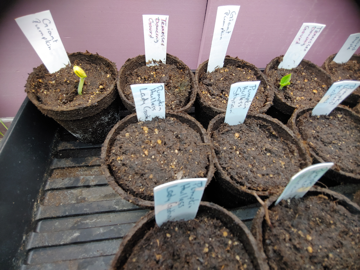 In the large aquarium greenhouse, I’m happy to say I’m now seeing more tomato seedlings starting to push their way through the soil. More amazingly, I spotted a hint of green in one of the giant pumpkin pots! That was much quicker than I expected.