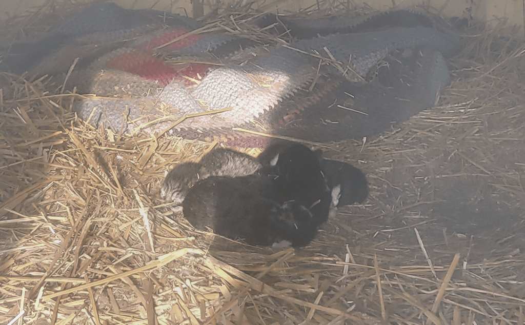 I wasn’t able to see much of the kittens through the biggest cat’s house window, but when the girls went out later, they were surprised to see several adult cat heads, peering at them through the window! They were able to see a kitten behind them, but didn’t want to stay too long or get too close and disturb them. I’m surprised about the other cats. Since Junk Pile had her kittens, I’ve only seen her in there.