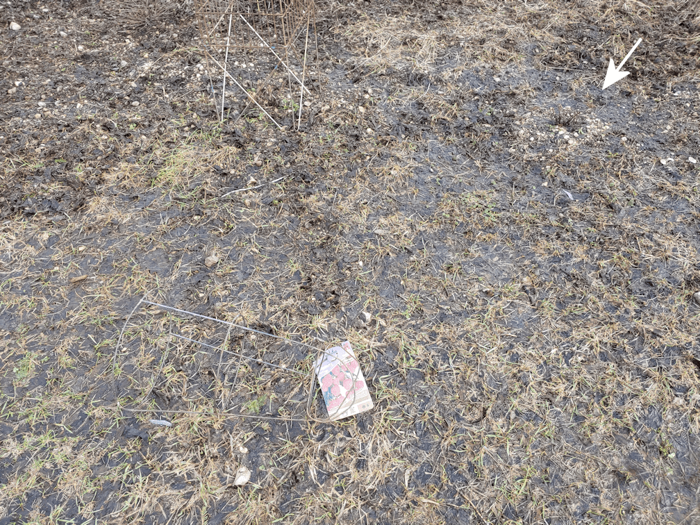 The arrow in the above photo is pointing to the raspberry bush, and shows where the cage is supposed to be. The cages got dug out of the scrap pile around the old garden shed and placed over the raspberry bushes, after we discovered the deer were nibbling on them.