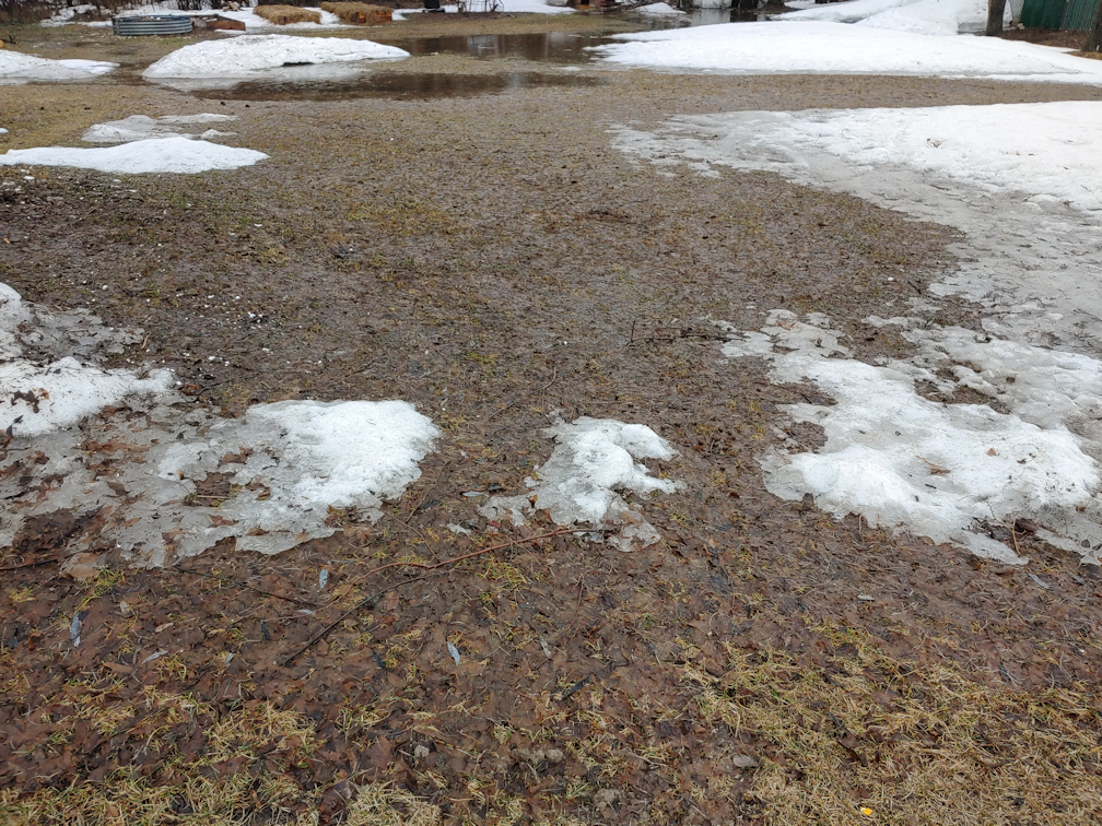 This is the area by the feeding station, where a lane had been made for the septic truck. There is a lot spot near where the pile of poplar wood is that always gets water when the snow melts, but this is the first time I’ve seen the water extend to far towards the gate in the chain link fence!