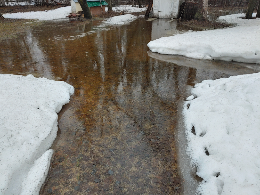 Enough snow has melted that I could check out a few other areas, once I got back home. The path to the outhouse and the back of the garage is still full of water, and the pit under the outhouse is flooded to the top.