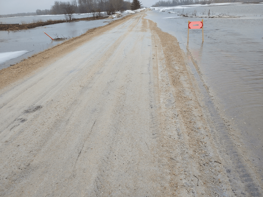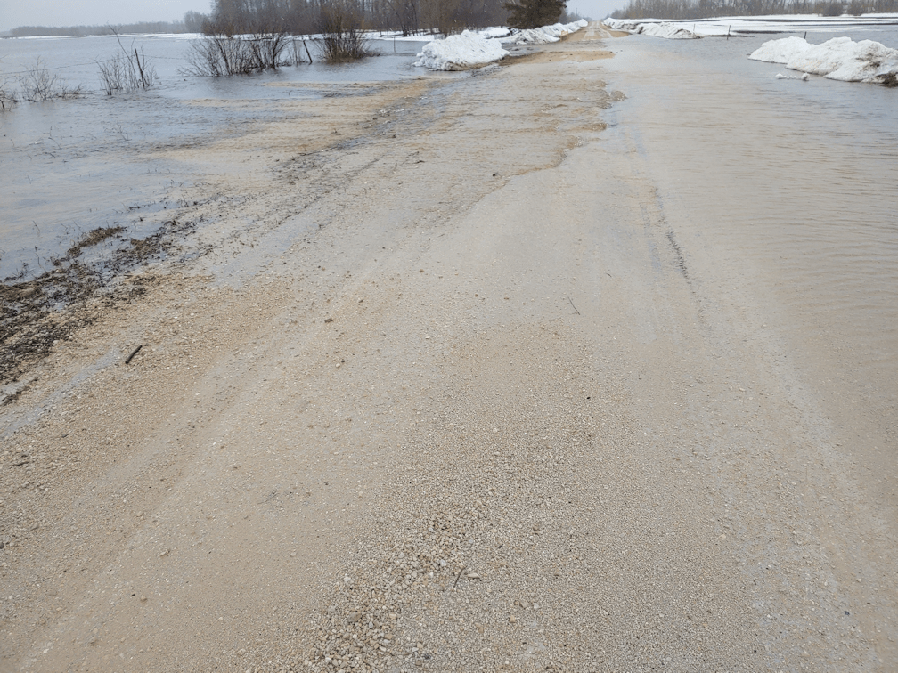 The gravel road was bad yesterday, but it was much worse today. The road itself was drier, but the last mile had water levels from the north that were higher. On the way back, I made a point of stopping near one of the municipal drainage ditches to take photos.