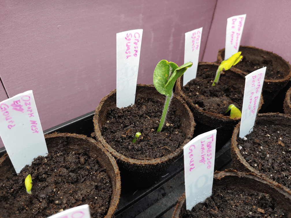 Last year, it took forever for the squash and gourds to germinate, and many pots never did. This is a huge improvement. I think there is a combination of reasons. One being the scarification of the seeds – except the dancing gourds, which were too small – and the other being the use of a heat mat.