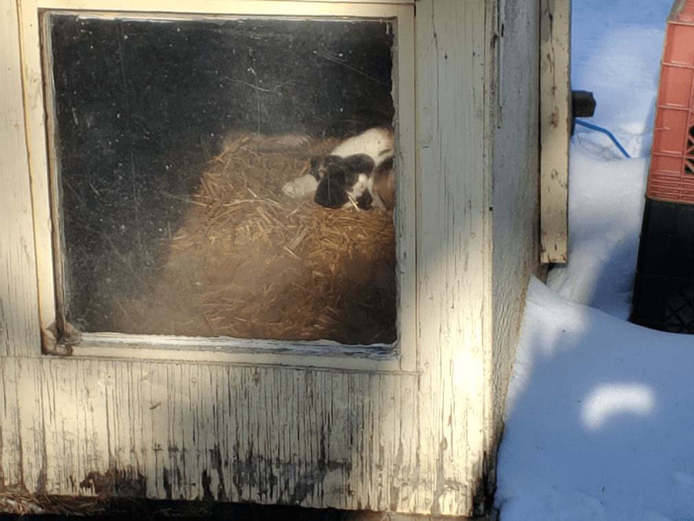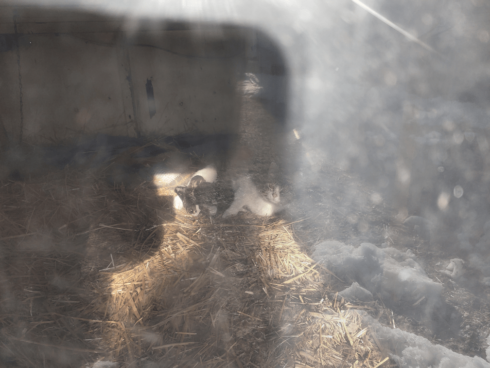 While Junk Pile was busily eating, I refreshed the water bowls with warm water, then quickly shoved my phone right up against the window to try and get a photo of her babies.
