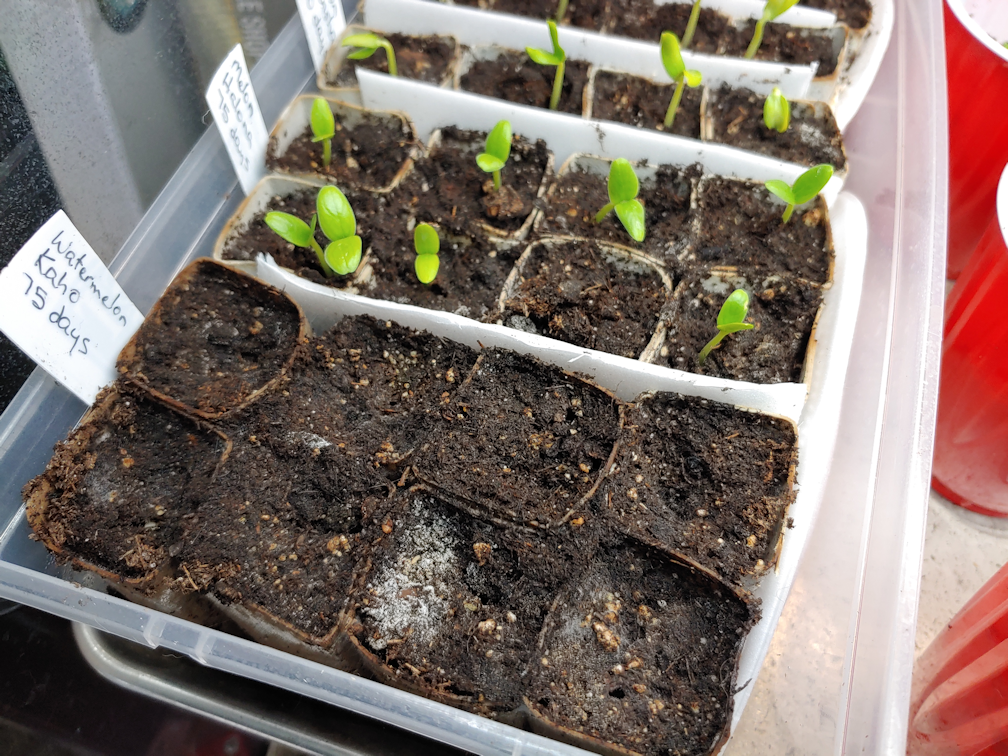 There still aren’t any watermelons yet, but if you look at the back of the second picture, you can see our first Zucca melon has germinated!