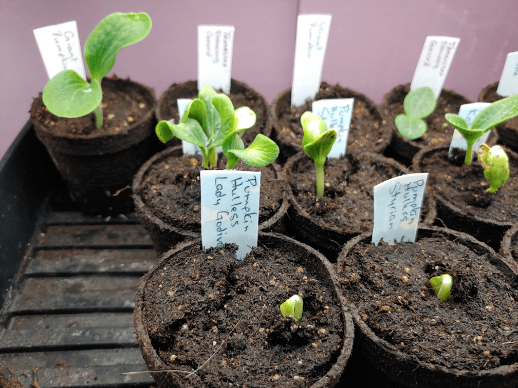 I’m just thrilled with how fast the hulless pumpkins are coming up. Since taking this photo, the ones in front are fully emerged.