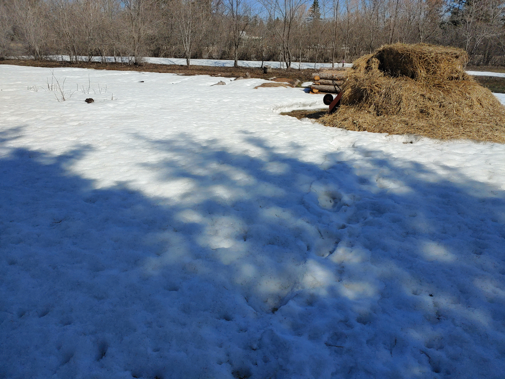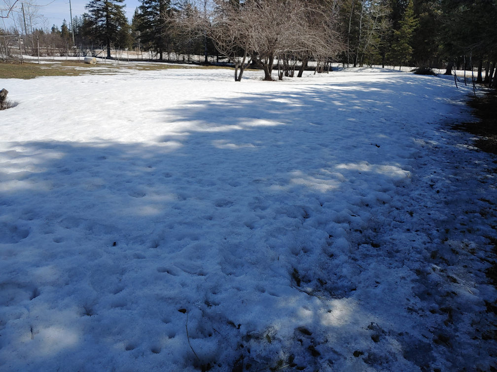 This is the view from the fence line. I’m still not even trying to get to the sign cam through the garden. Quite a lot of the snow has melted away, and the area by the squash tunnel (which will be used for pole beans this year) is pretty clear.