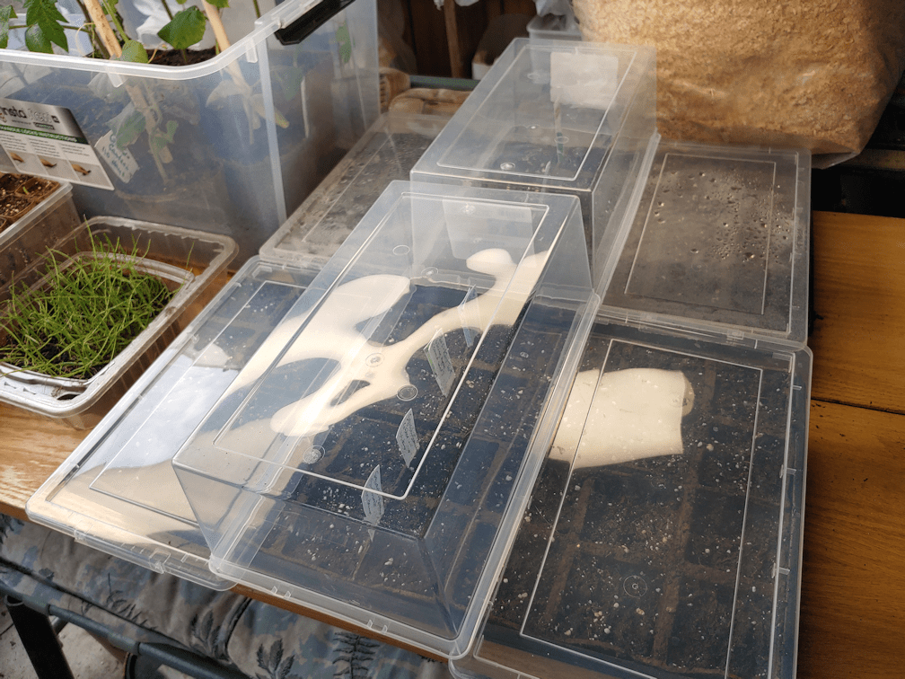 The tray then went straight into the sunroom, covered to keep them moist until they germinate. As you can see by the one that got pushed to the back, it’s working rather well.