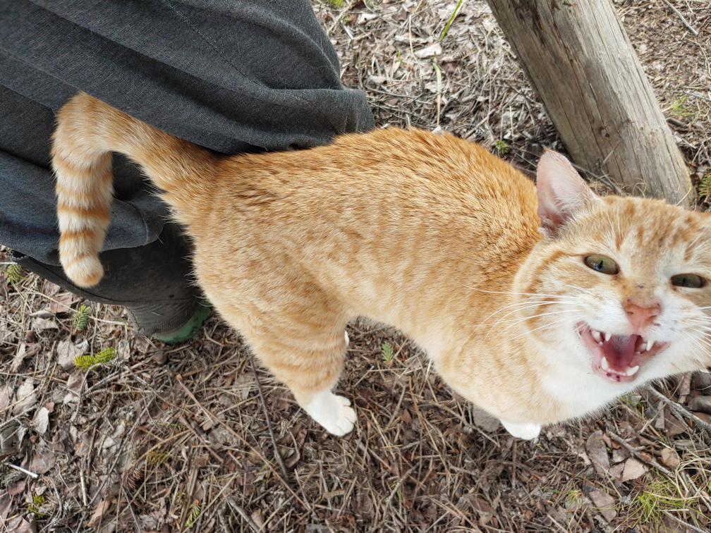Which reminds me; while topping up the cat food last night, I got to touch Rosencrantz a bit and finally got a closer look at one of her ears. I thought she might have lost the tip to frost bite over the winter, but the tip is still there! It’s just badly torn. Not a new injury. Not much we can do about it, unfortunately.